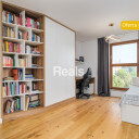 Na powierzchni 104 m2 znajduje się przestronny salon z częściowo otwartą kuchnią, gabinet, duża sypialnia z wyjściem na taras, z pojemną szafą oraz wchodzoną garderobą posiadającą okno i z wyjściem na taras, łazienka z wanną, nieco mniejszy pokój z wyjściem na balkon, łazienka z kabiną prysznicową, pralnia oraz przedpokój z dwoma pojemnymi szafami w zabudowie.